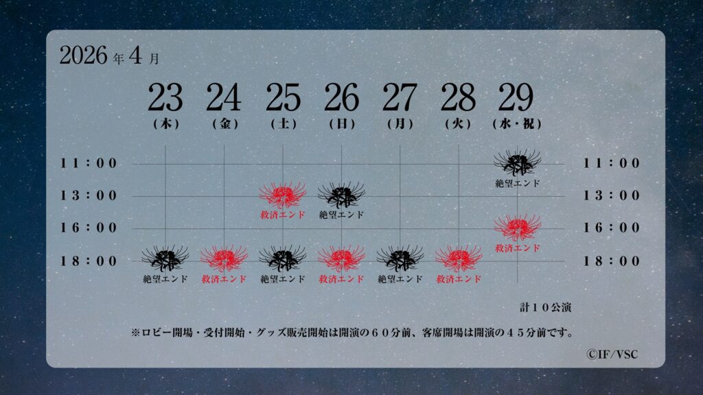 2026年4月23日(木)~4月29日(水・祝)に有楽町よみうりホールにて上演が決定しました。今作も絶望エンド・救済エンドの2パターンでの同時上映となります。また、本日9月14日(日)17:00~オフィシャル先行(抽選)、オトメイトファンクラブ先行(抽選)、キャスト先行(抽選)にてチケット予約も開始。詳細は下記をご確認ください。