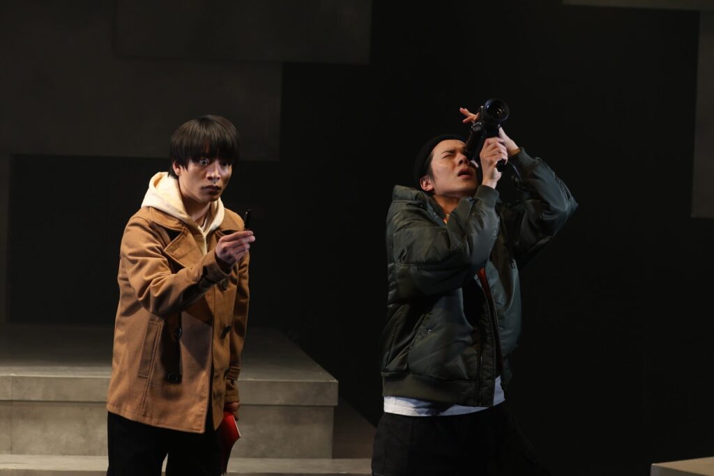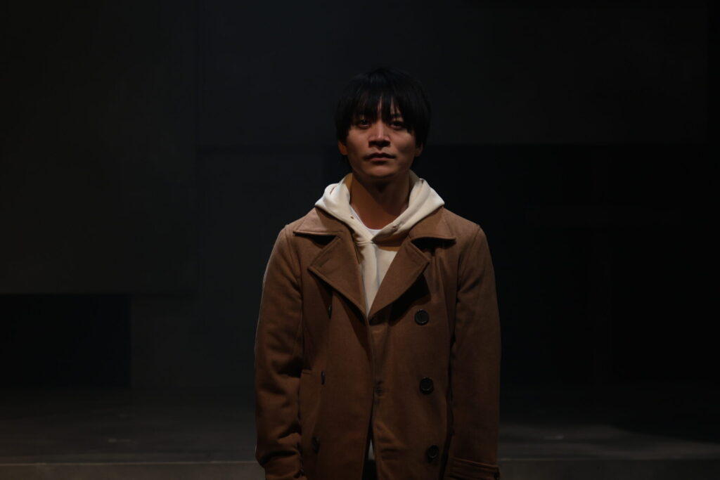 主人公である遠藤を演じるのは今江大地。数々の舞台で真ん中に立ってきた彼であるが、これだけの近さで、マイクを通さない生の声で、彼の芝居を浴びられるのは幸福なことだ。比較的小規模な劇場だからこそ、肉眼で表情や声色の変化を感じられる。声を荒らげたりはしない人物なだけに、わずかにある激しく感情を高ぶらせるシーンでの感情の爆発が印象に残る。特に、あるドキュメント映像の後からは「これをやりたい」と言わんばかりに意志の固まった目と表情になるのでぜひ注目して観てほしい。