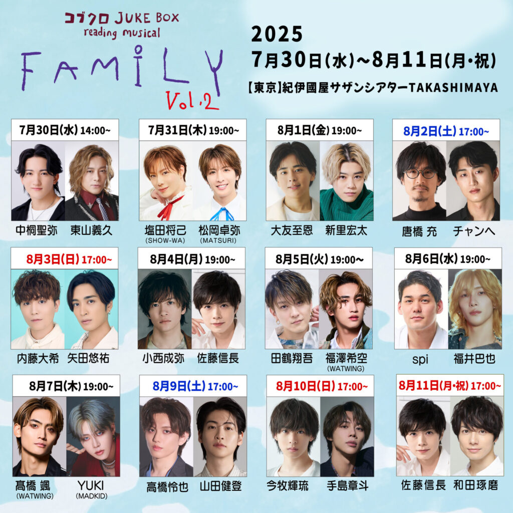 「コブクロ JUKE BOX reading musical”FAMILY”vol.2」は、7月30日(水)〜8月11日(月・祝)まで東京・紀伊國屋サザンシアターTAKASHIMAYAにて上演中。その日限りのキャストが織りなす奇跡の一瞬を、ぜひ劇場で体感してほしい。