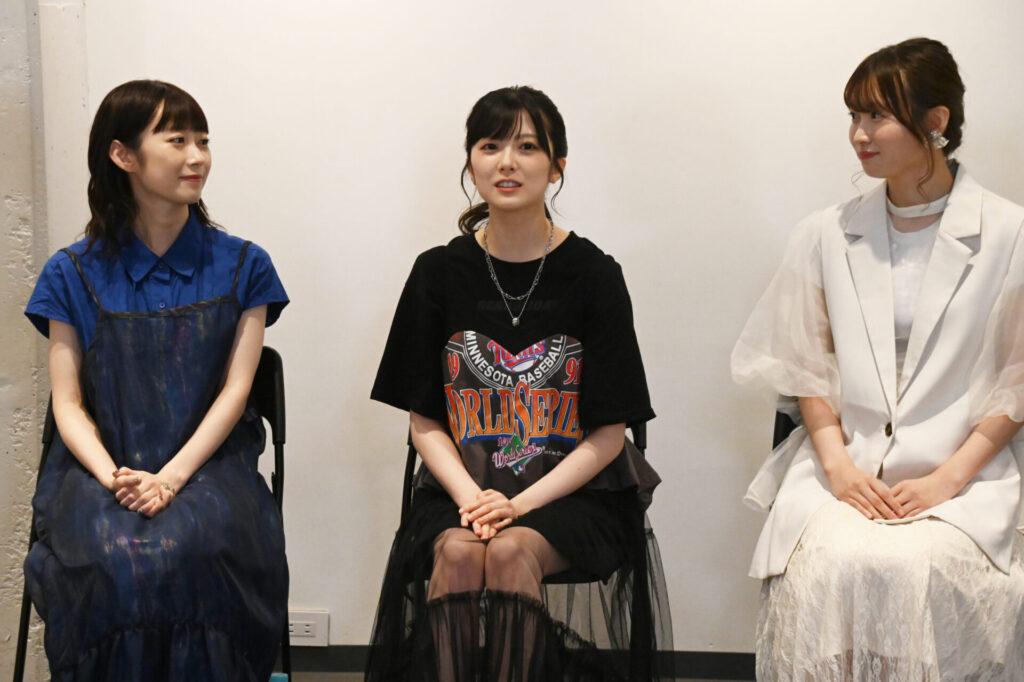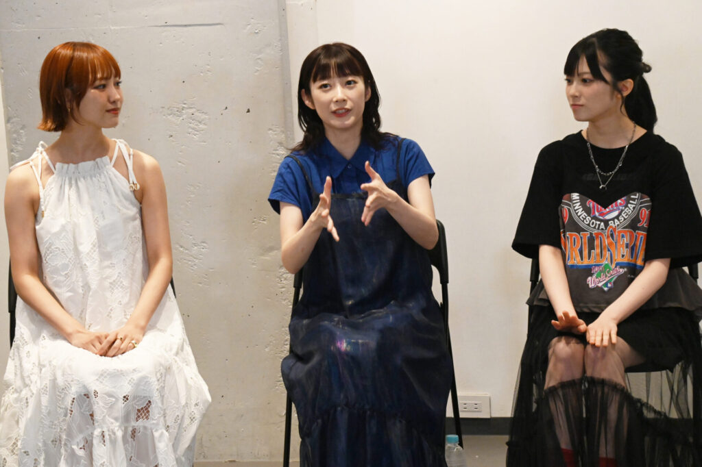 河内「私はギターを演奏します。実はギターを1ミリも触ったことがなくて。先生にも色々教えていただいて、もうとにかくまずは止まらずに弾くことっていうのを目標にコードも全部覚えて、とりあえず指の形を全部覚えて、だいぶ止まらないで弾けるようになりました。こういう機会がなかったらギターに触れることもなかったから、すごい貴重な機会だし、やっぱり難しい曲だからこそ、みんなで合わせたら楽しいんだろうな、みんなでバチッとはまった時に楽しいんだろうなっていうのはすごく感じるので、本番皆様にお届けできる日まで、しっかり本編の芝居も含めて一緒に、ブラッシュアップできたらいいなって思っています。」