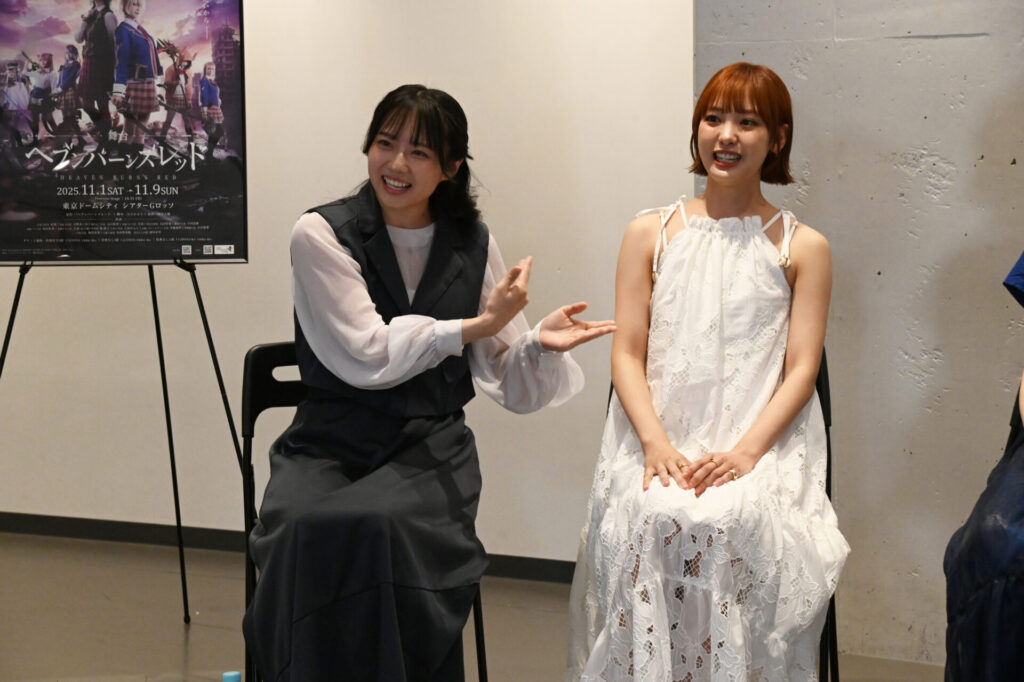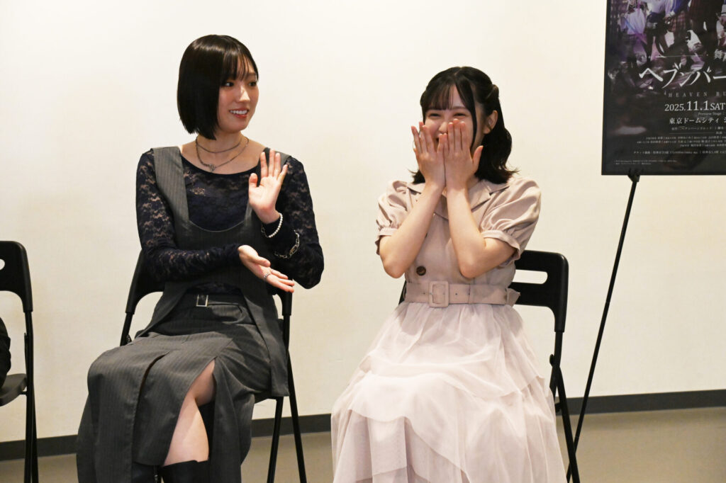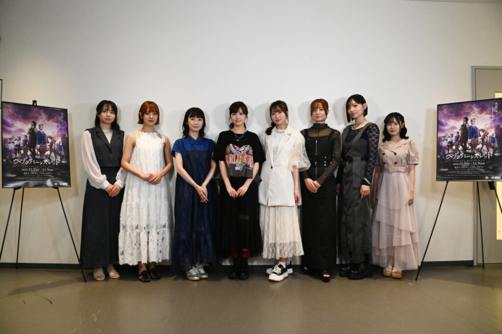 各々見どころとして『31Aが みんなでお部屋にいる時のやり取り』『劇場がシアターGロッソなのでアクションに期待』『コメディもシリアスも全部ひっくるめたヘブバンの世界』『可愛いだけじゃなくて、本当に命を懸けて戦う熱い姿』と語る中で、最後に結那さんが「月歌ちゃんみたいにみんなを引っ張っていくぜ!みたいなのがちょっと心配な部分はあったんですけど、こうやって皆さんのお顔を見ると、みんなにお力をいっぱい借りるんだろうなって思いながら、でも自分自身もやっぱり座長としてしっかりしていかなきゃいけないなってすごく感じています。このヘブバンが絶対成功するように、他のキャストの方々と、1人1人上辺だけじゃなくて、ちゃんと心の上でコミュニケーションを取り合いながら、精一杯作り上げていきたいなと思っております。皆さんのことを、あなたのことを私たちはお待ちしていますので、皆さん是非遊びに来てください。よろしくお願いします。ありがとうございました!」と挨拶し合同取材会は終了しました。