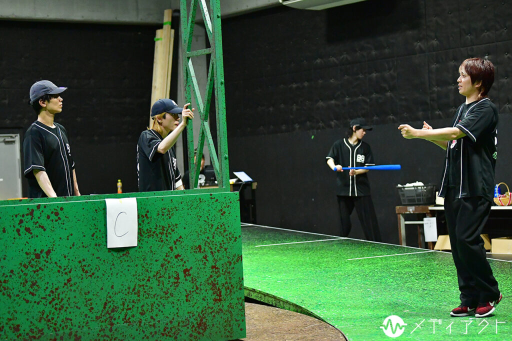 「監督のハートを撃ち抜く方法」をめぐっては、「ショットガン使いますか?」「バットを銃に見立てては?」など、自由な発想の意見交換が次々と飛び出す。櫻井は提案された動きをすぐに取り入れ、コミカルなシーンであっても全員が一切手を抜かず、作品をより良くしようという熱意が稽古場全体に満ちていた。