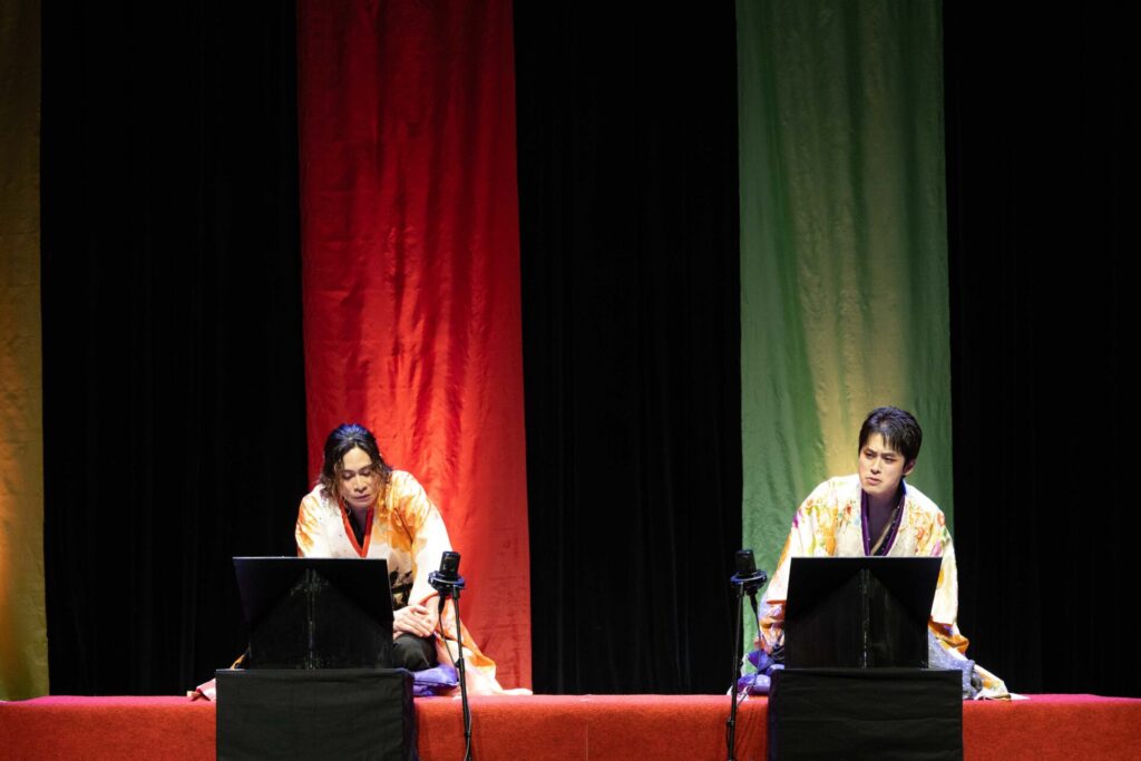本作は、現代風にアレンジした古典落語を二人一組で演じる、テンポの良い掛け合いが魅力の掛け合い落語。出演者は公演毎に組み合わせも変わるため、同じ演目でもその日その日の違いを楽しめる。男花魁をイメージした艶やかな衣装も見どころの一つ。本公演は、「刀屋」「中村仲蔵」「鹿政談」「浜野短随」の四演目。ハンサム落語では全演目新作となるお噺を披露。そして今作も、カーテンコールではキャストが客席を練り歩きお客様が”おひねり”を渡せる時間も設けられている。本公演に先駆け、公開ゲネプロを開催されました。