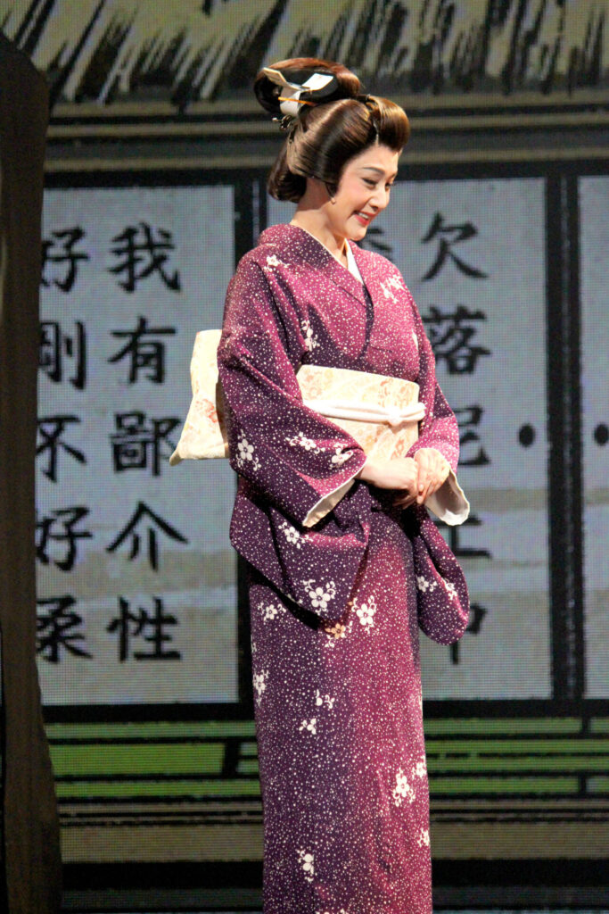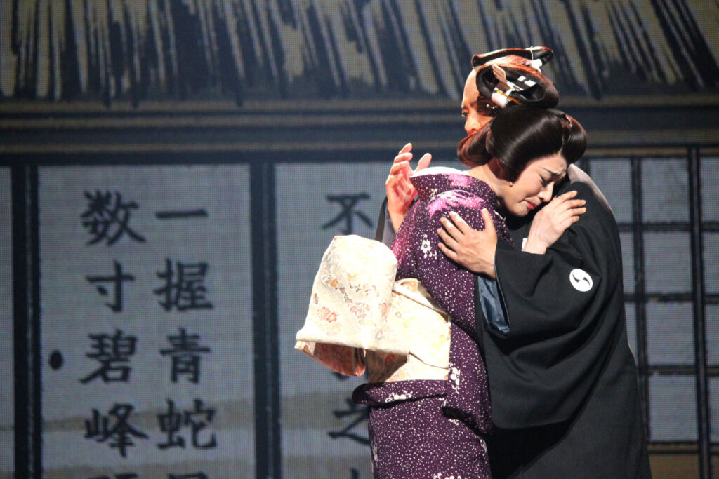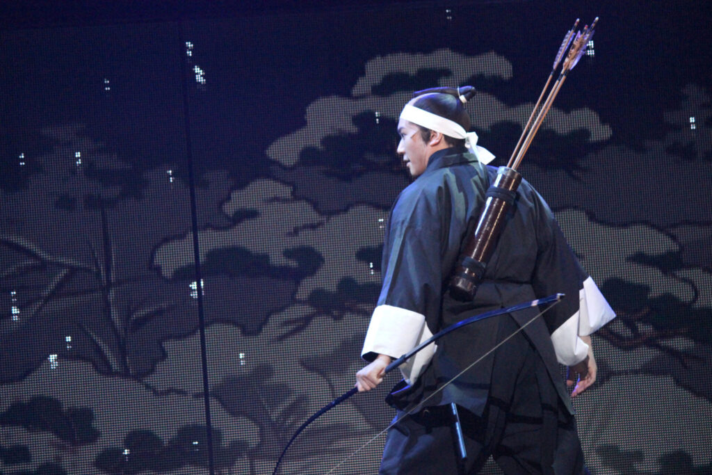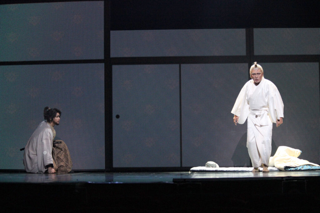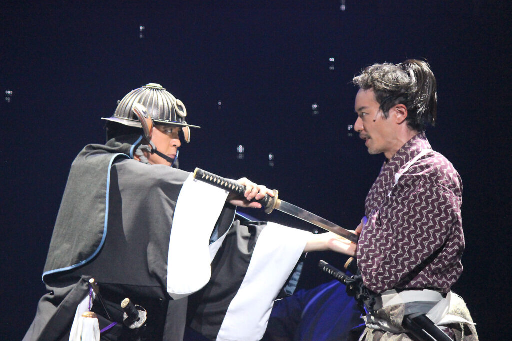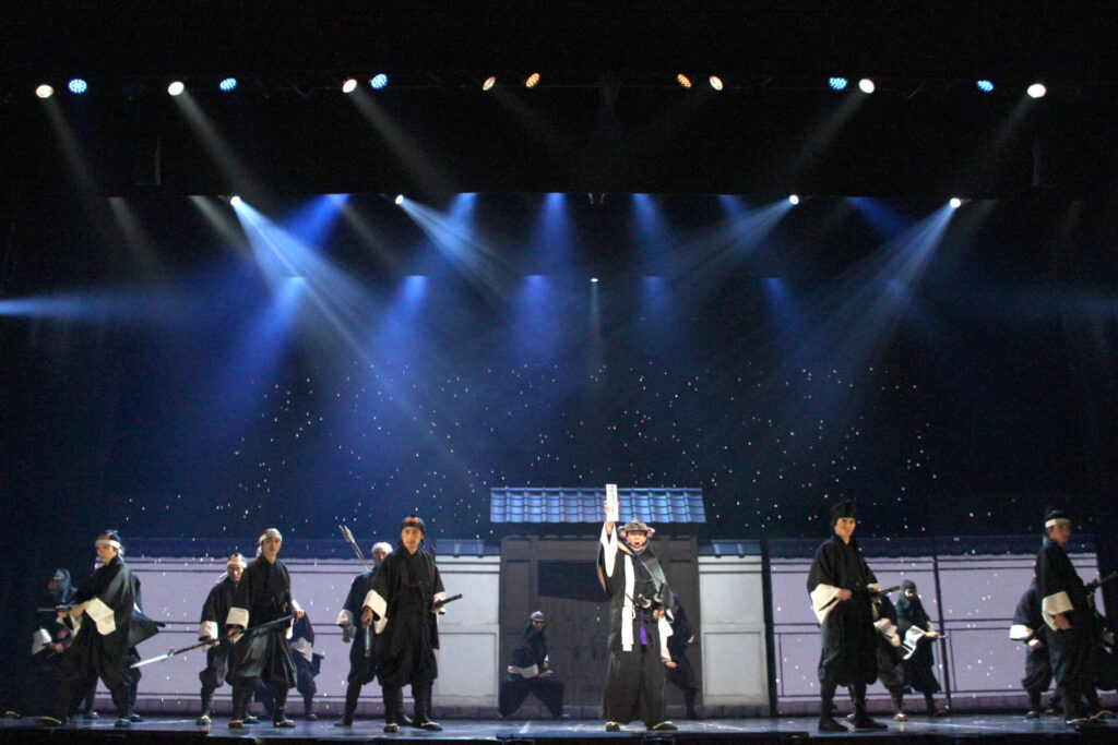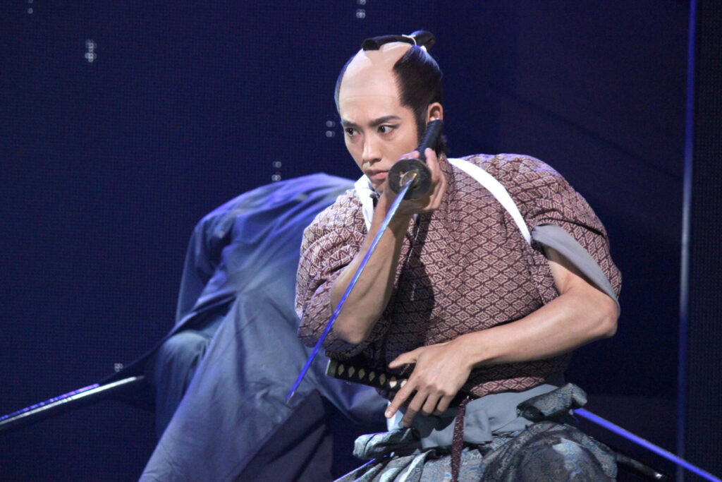 まずは、クライマックスとなる吉良邸への討ち入りシーンの出だし。LEDのパネルと実在のセットが混在する舞台上で雪が舞い降り、えも言われぬ臨場感を演出する。「これぞ忠臣蔵」と手を叩きたくなるような名シーンだ。続いて大迫力の殺陣シーンでは、四十七士と吉良側の家来が入り乱れ、良い意味でどこに誰がいるのか分からぬほどの動きを見せる。当日もきっとこのような大混乱の中で激しい戦いが繰り広げられたのだろうと想像できる。