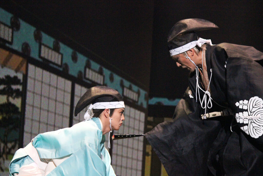 最後に「忠臣蔵と言えば」とも言える、松の廊下の刃傷シーン。この刃傷事件をきっかけとして物語が大きく動き出す、忠臣蔵きっての名シーンであり重要なシーンだ。江戸城本丸の松の廊下で、吉良と浅野が出会い、それまで辛抱を貫いてきた浅野がついに吉良へ斬りかかる。劇中では序盤の出来事ではあるが、最後の最後まで心にとどめておきたいシーンだ。また、浅野を演じる立石俊樹は、舞台後半では吉良方の剣士・小林平八郎を演じる。悲しいまでに真っすぐで、家臣を心から愛していた浅野と、見るからにダーティな雰囲気を漂わせる小林との演じ分けにぜひ注目を。