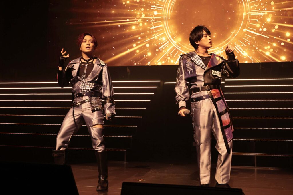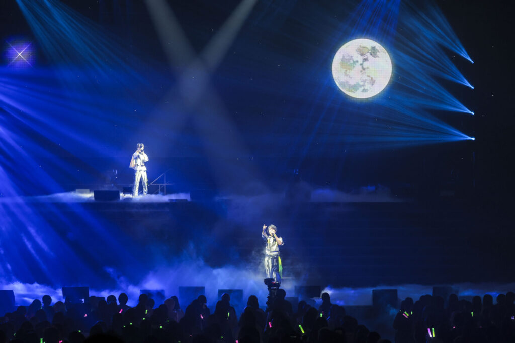 三日月が満月へと移ろい、モールス信号が響くと「夜明けのポラリス」へ。熊谷 俊輝(輝矢 宗氏役)と堂島 颯人(久楽間 潮役)が、静かな情熱を秘めた歌声で観客を惹き込む。