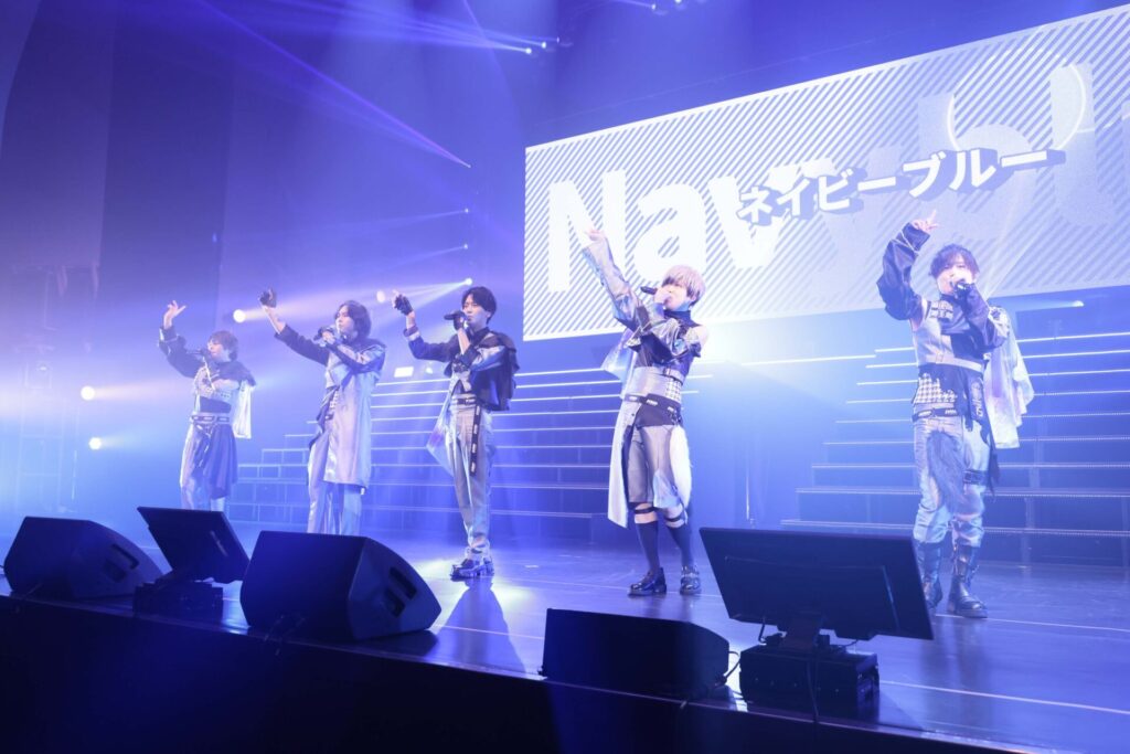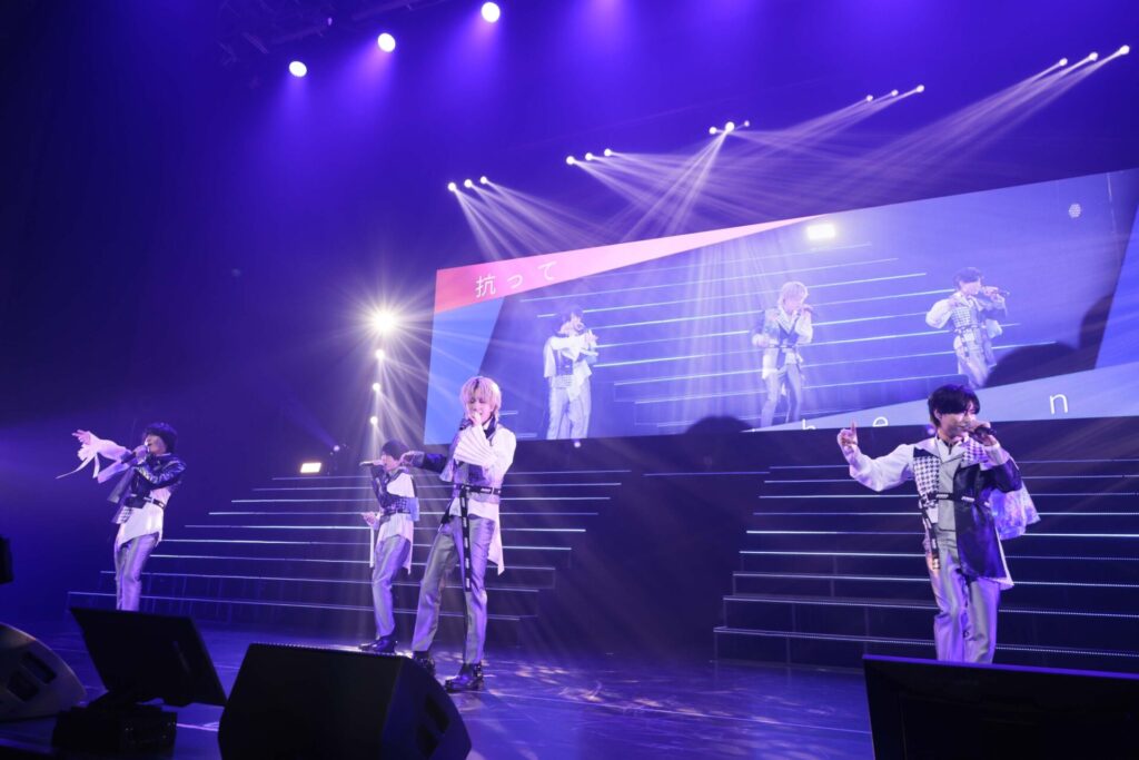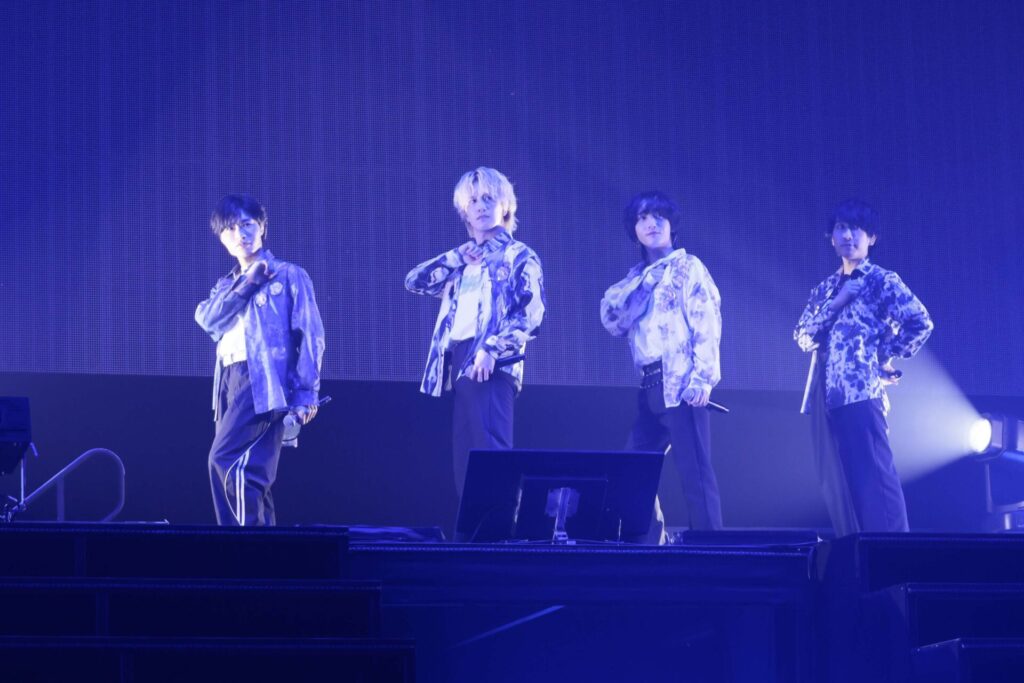 続いては、L4mps(らんぷす)による「ネイビーブルー」。落ち着いた声質のリーダー・坂田 将吾(蜂乃屋 凪役)の歌い出しが会場を包み込み、穏やかな雰囲気が広がっていく。サビで聴かせる少し高めの音域も心地よく、静かな余韻を残す楽曲だ。