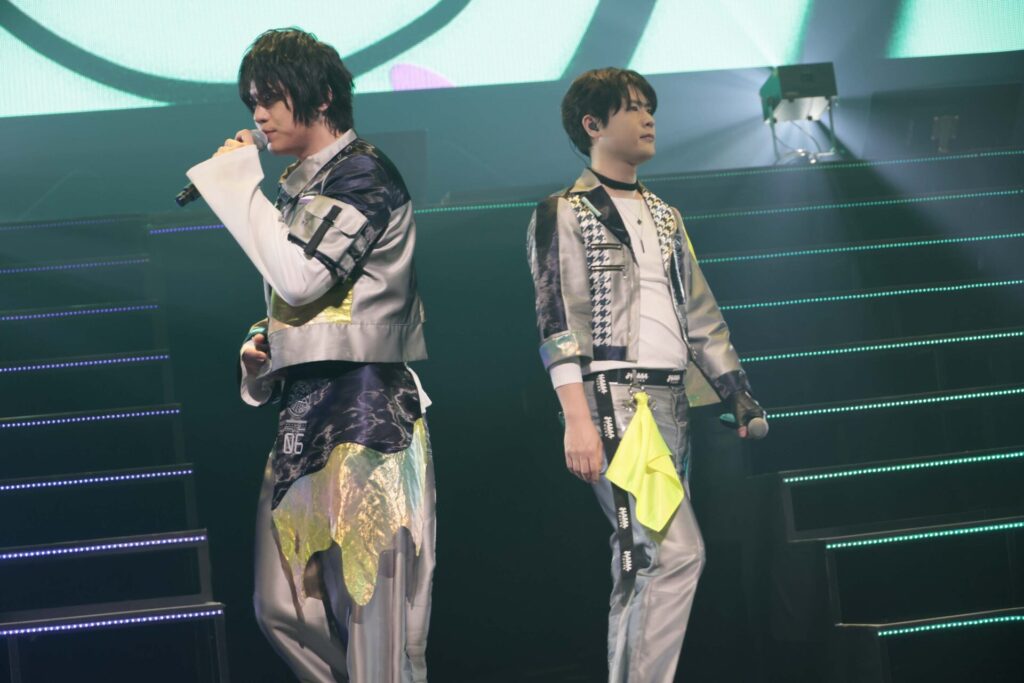 スクリーンに飛行機の映像が映し出されると、佐藤 祐吾(衣川 季肋役)と大塚 剛央(斜木 七基役)が登場。「ガラスワールド」では一転して柔らかなメロディが響き渡る。それぞれのキャラクターのイメージカラーに染まった会場で、2人の繊細な歌声が溶け合った。